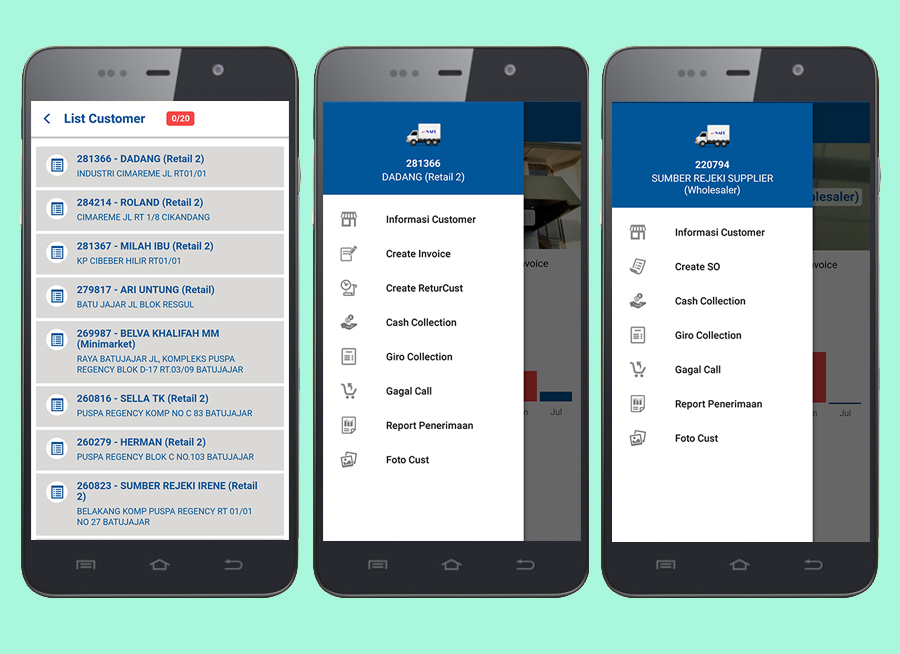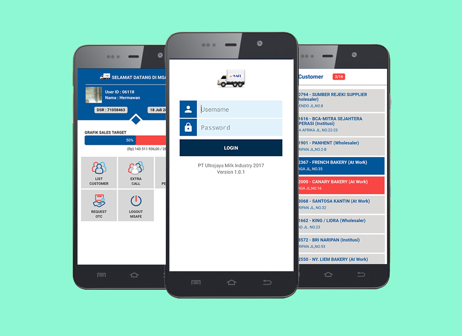 Aplikasi yang membantu pihak sales Ultrajaya maupun Campina untuk bertugas mengunjungi customer. Diintegrasikan dengan aplikasi SAFE, mSAFE juga dapat sebagai aplikasi monitoring aktifitas yang telah dilakukan oleh pihak sales. Download Manual Book-nya Disini:
